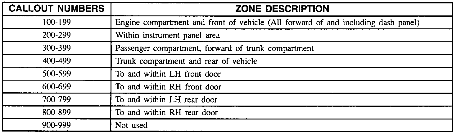 All grounds, in-line connectors, pass-through grommets and splices are given identifying numbers according to where they are located in the vehicle. The above chart explain the numbering system.