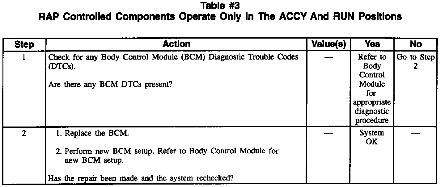 Table #3 RAP Controlled Components Operate Only In The ACCY And RUN Positions: