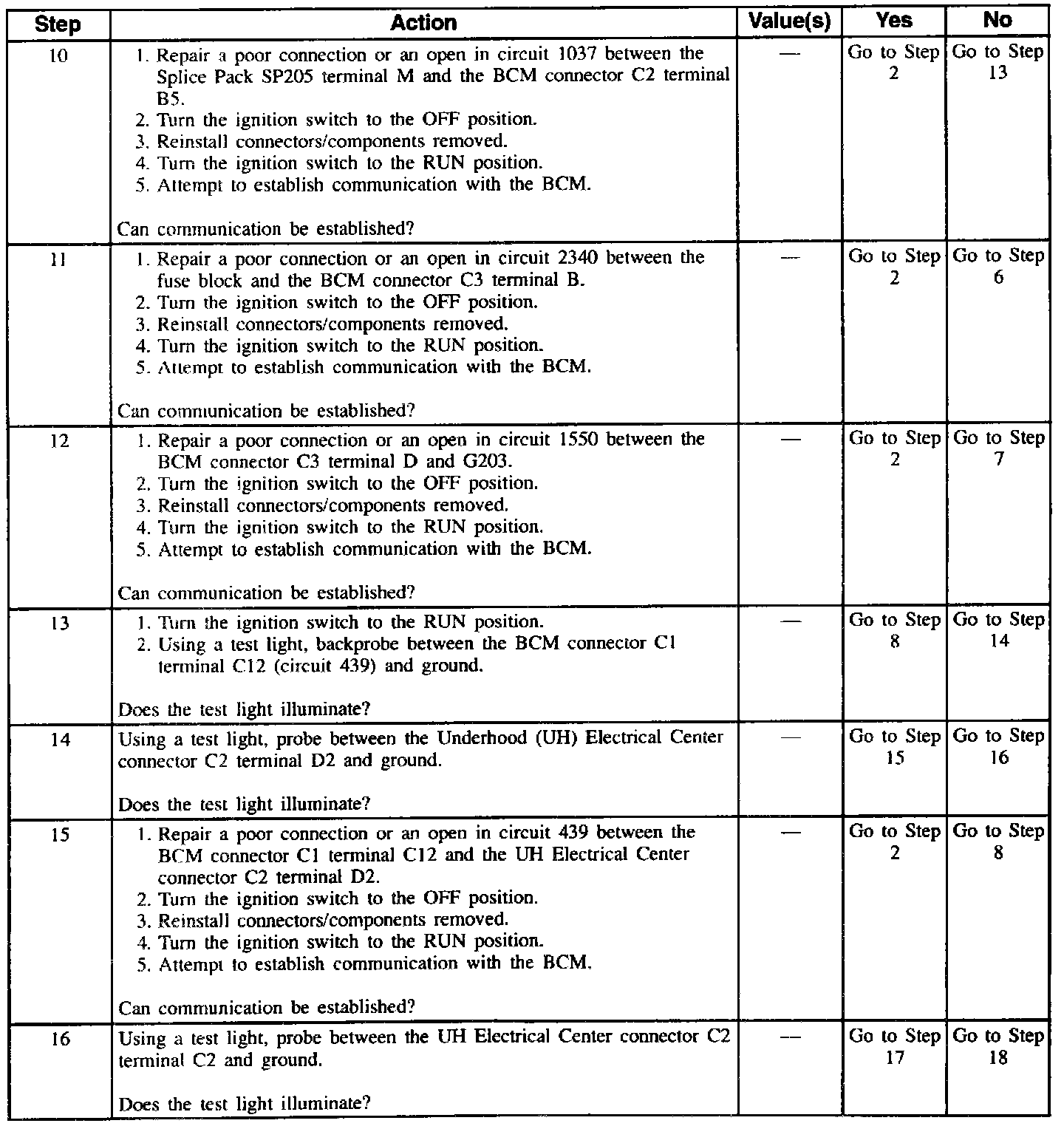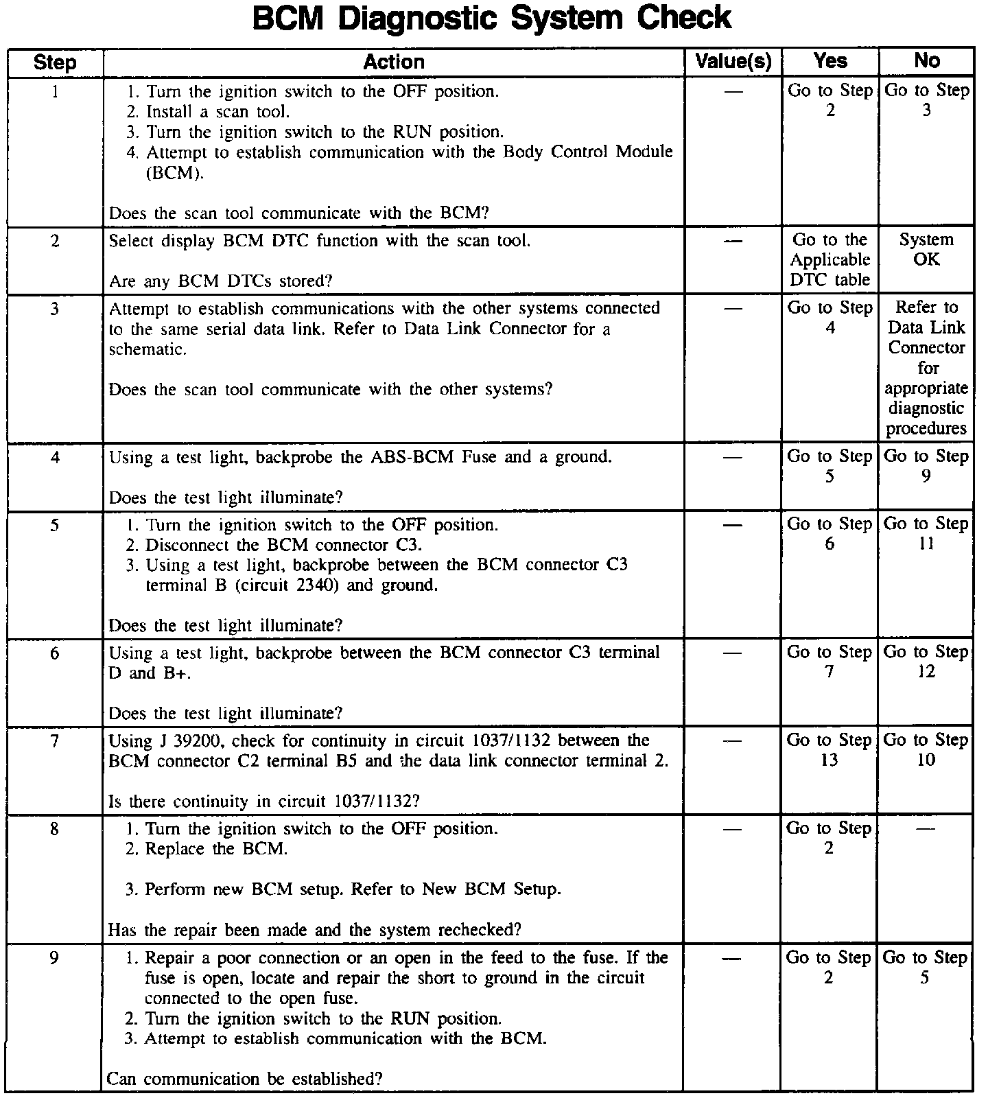 The Body Control Module (BCM) Diagnostic System Check is an organized approach to identify problems associated with the BCM. This check must be the starting point for any BCM complaint, and will direct you to the next logical step in diagnosing the complaint. The BCM is very reliable component and is not likely the cause of the malfunction. Most system complaints are linked to faulty wiring and connectors, and occasionally to components. Understanding the computer system and using the tables correctly will reduce diagnostic time and prevent unnecessary parts replacement.