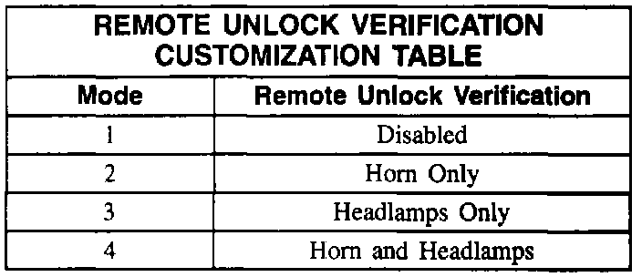 Important: If the ignition switch is moved to the "OFF" position or any vehicle door is opened during this procedure, the remote unlock verification customization will he terminated and the system will remain in the most recent mode.