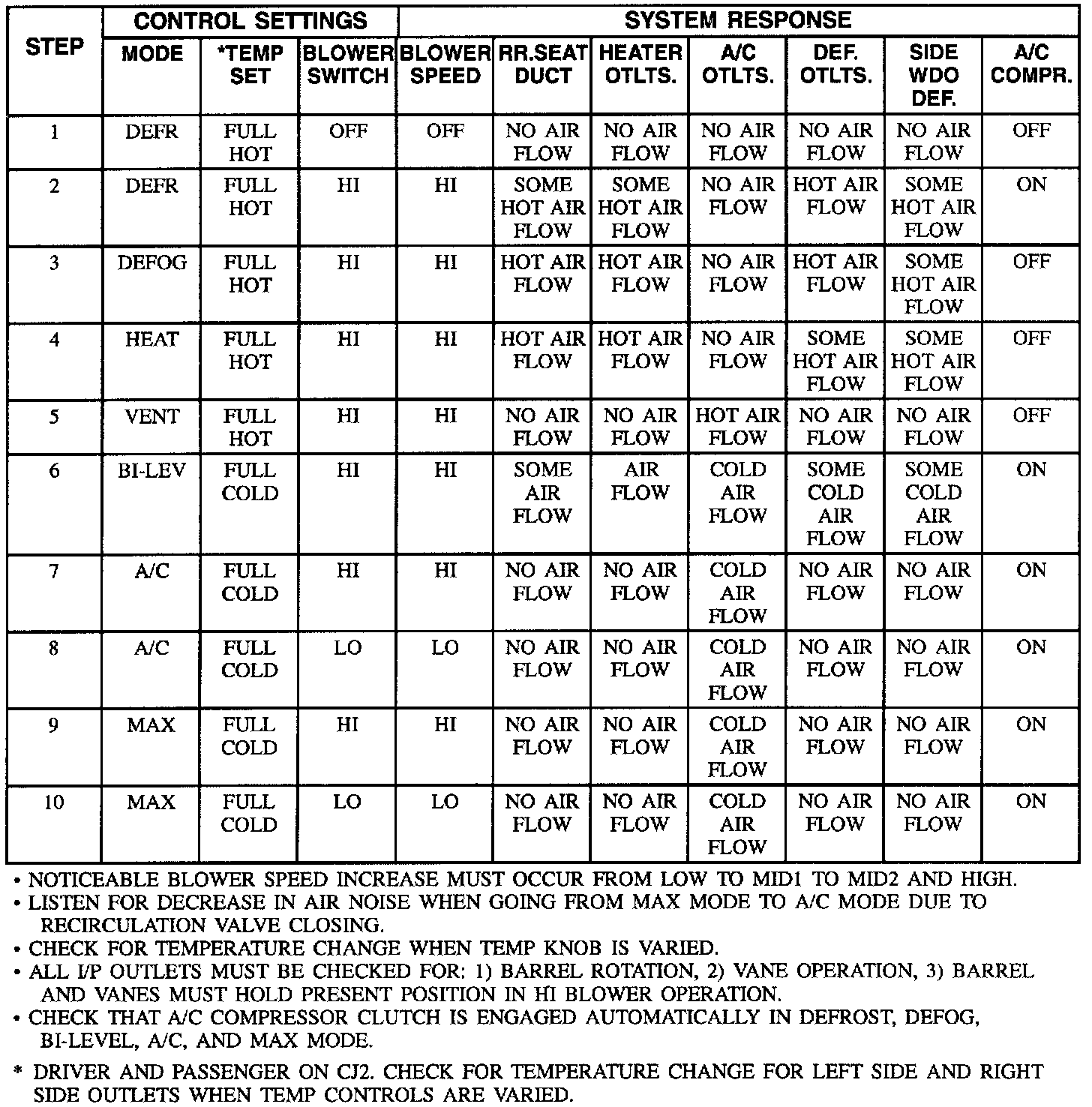 2. Operation of the A/C control selector (mode) to distribute air from designated outlets would indicate proper functioning.