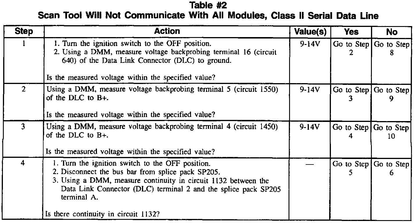 Table #2 Scan Tool Will Not Communicate With All Modules, Class II Serial Data Line (Part 2 Of 6):