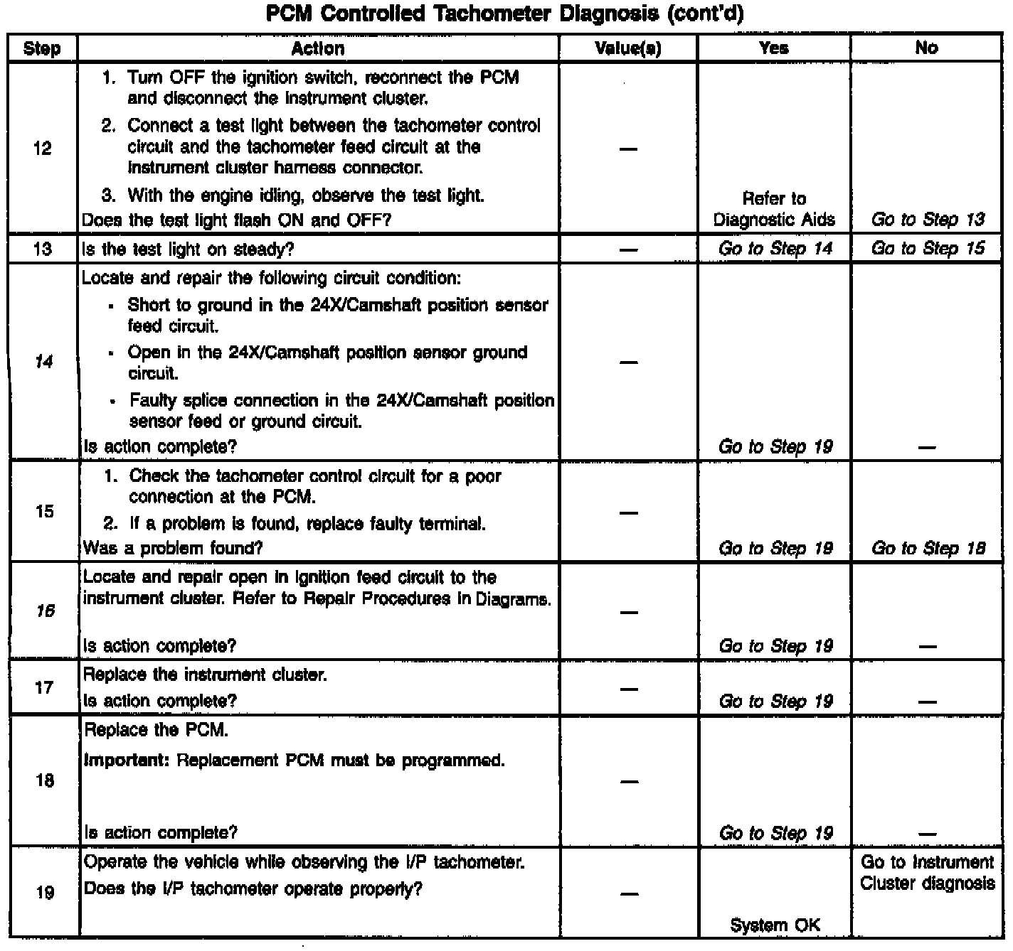 14. A fault in the 24X/Camshaft position sensors feed or ground circuits will result in the loss of both PCM input pulses. Without a 24X reference pulse the PCM can not begin tachometer pulse control causing an inoperative tachometer.