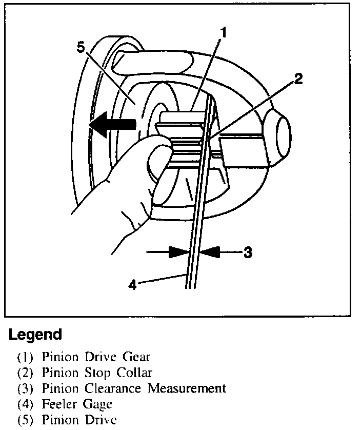 5. Press on drive just enough to take up any free movement of the pinion on the shaft. Use feeler gages to check clearance between end of pinion and pinion stop collar.