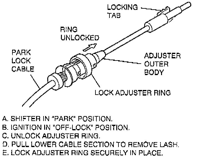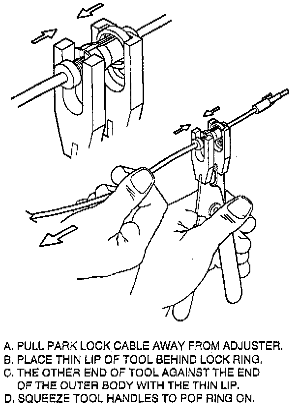 d. Pull on cable until park lock latch contacts gear shift lever.