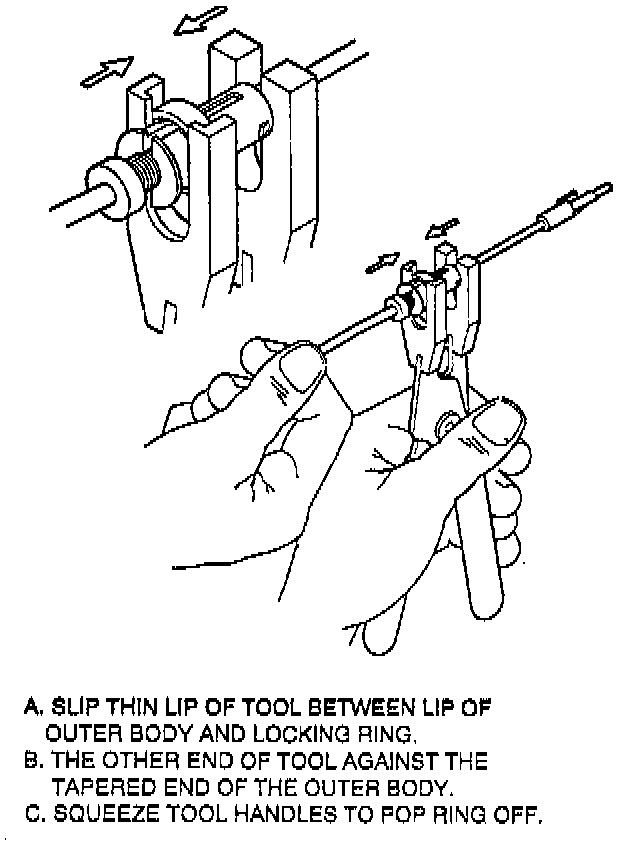 ^ Insert small blade screwdriver into slot in lock module assembly (15). Push against locking tab on end of cable assembly (48) and remove.