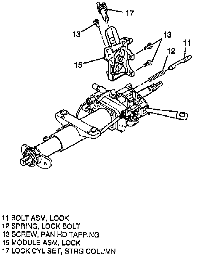 NOTICE: Lock bolt assembly (11) is under slight spring tension from lock bolt spring (12). Hold lock bolt (11) in place while removing lock module assembly (15).