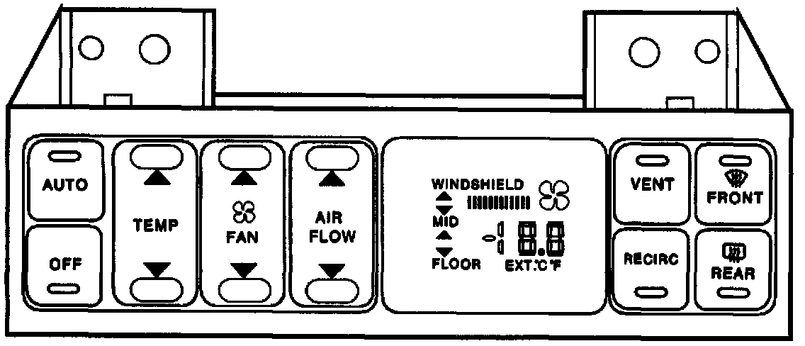 The heater and A/C control assembly allows the vehicle operator to communicate with the system. The heater and A/C control assembly includes soft-touch buttons for the various system operating modes (OFF, AUTO, DUAL ZONE, HEATER, ECONOMY, DEFOG, DEFROST), fan speed control (AUTO, LO, HI), temperature control (COOL, WARM), rear window defogger and outside air temperature display. Each operating mode button (except OFF) contains an LED indicator which illuminates when that mode is selected. The rear window defogger also has an LED indicator.