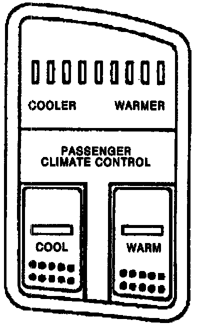 The passenger temperature control includes 2 soft-touch buttons and a bar segment display. The buttons (COOL, WARM) are used to raise or lower passenger side outlet air temperature. The bar segment display is made up of 9 LEDs (4 green, 1 amber, 4 red) and indicates passenger-side outlet air temperature relative to driver-side outlet temperature. The passenger climate control assembly is activated only when the system is operating in the dual zone mode.