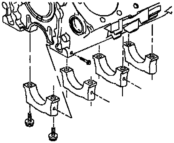 Notice: In order to prevent the possibility of cylinder block or crankshaft bearing cap damage, the crankshaft bearing caps are tapped into the cylinder block cavity using a brass, lead, or a leather mallet before the attaching bolts are installed. Do not use attaching bolts to pull the crankshaft bearing caps into the seats. Failure to use this process may damage a cylinder block or a bearing cap.