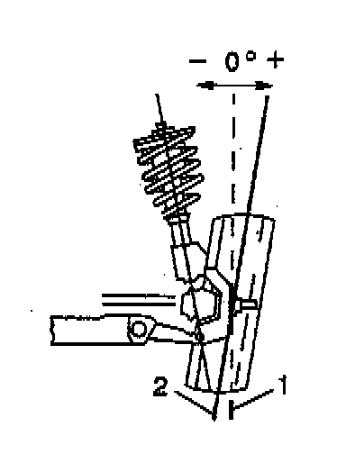 Camber is the tilting of the wheels from the vertical when viewed from the front of the vehicle. When the wheels tilt outward at the top, as shown, the camber is positive (+). When the wheels tilt inward, the camber is negative (-). The amount of tilt measured in degrees from the vertical is known as the camber angle. Camber influences both directional control and tire wear. Excessive camber results in tire wear and causes the vehicle to pull or lead to the side with the most positive camber. Camber adjustment is available at both the front and the rear wheels.