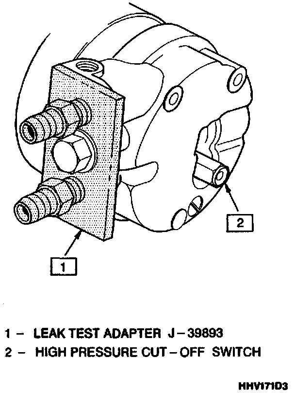 3. Using leak detector J 39400, check for leaks at pressure relief valve, rear head switch location, compressor front and rear head seals, through bolt head gaskets and compressor shaft seal.