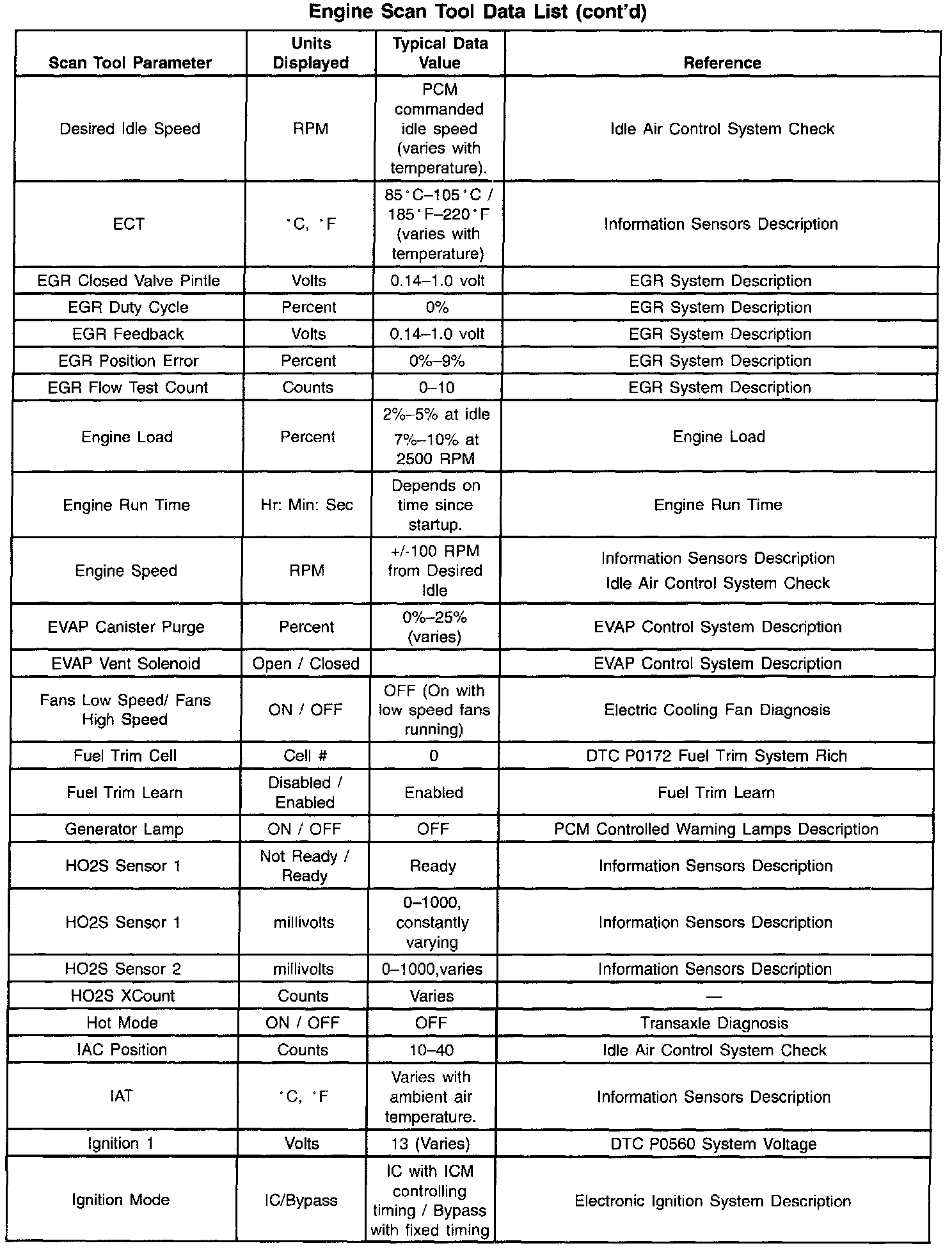 Use the scan tool data listed for comparison after the On-Board Diagnostic system check and finding the on-board diagnostics function properly with no diagnostic codes displayed. The Typical Scan Tool Data Values are an average of display values recorded from normally operating vehicles. The Typical Scan Tool Data Values are intended to represent what a normally functioning system would display. The values you get may vary due to a low battery charge or other reasons. But they should be very close.
