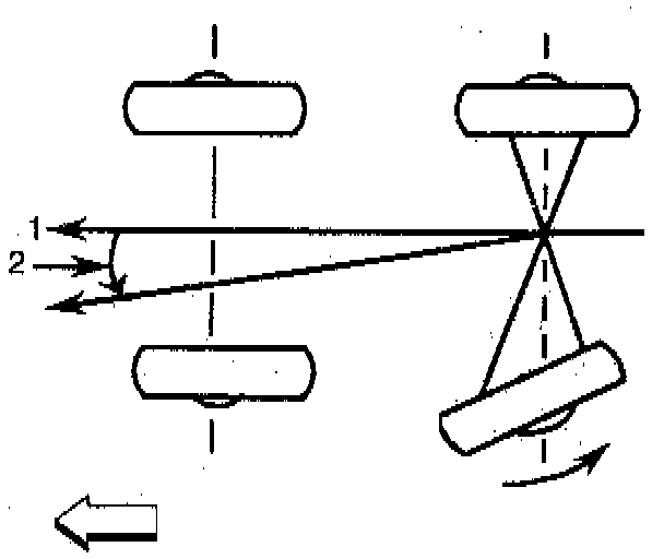 The front wheels aim or steer the vehicle. The rear wheels control tracking. The tracking action is relative to the thrust angle (2). Thrust angle (2) is defined as the path that the rear wheels will take. The thrust angle (2) should be aligned with the body centerline (1).
