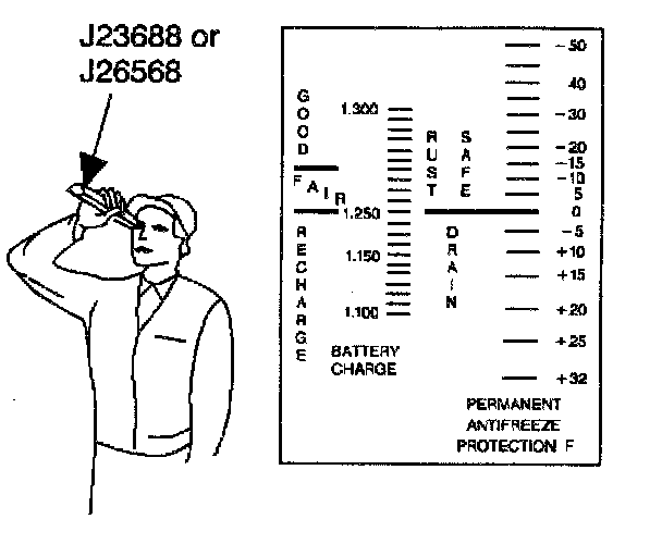 Coolant testers J26568 (Centigrade Scale) or J 23688 (Fahrenheit Scale) can be used to check the antifreeze protection of the coolant. Make sure the refractometer markings are correct. Unless J 26568 or J 23688 has a provision for temperature correction, test the temperature at which J 26568 or J 23688 is calibrated. If the coolant is warmer or cooler, the reading may be incorrect. Follow the manufacturers directions on using J 26568 or J 23688.