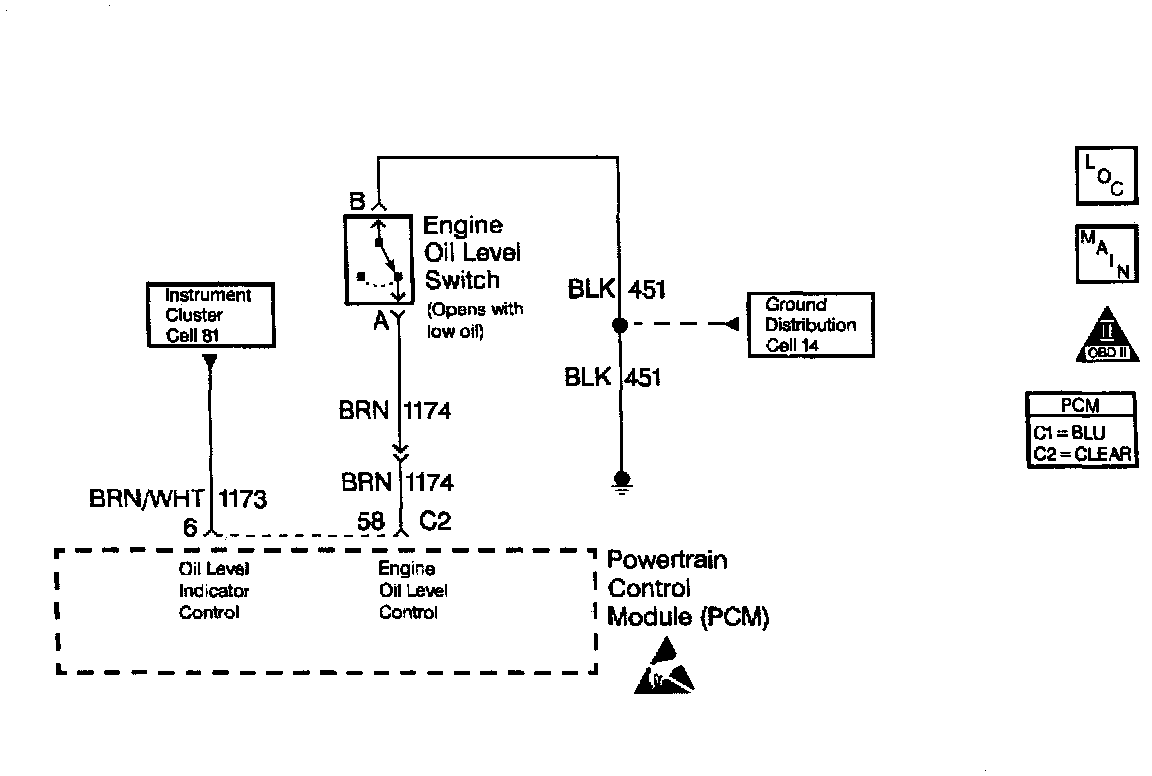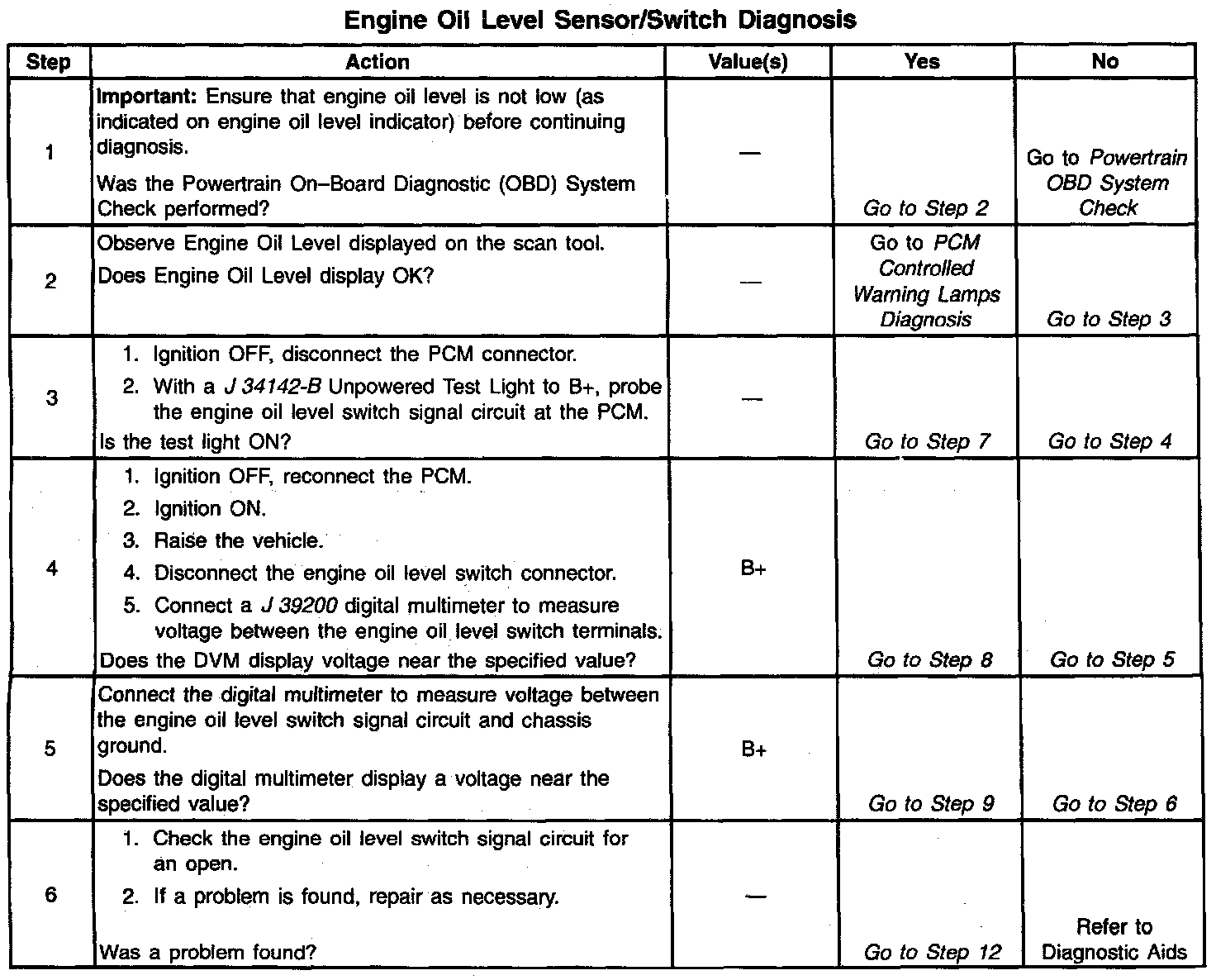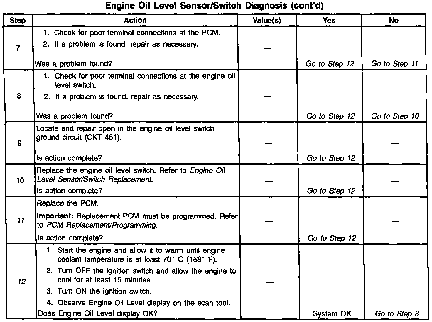 ^ Poor connection at PCM or oil level sensor. Inspect harness connectors for backed out terminals, improper mating, broken locks, improperly formed or damaged terminals, and poor terminal to wire connection.
