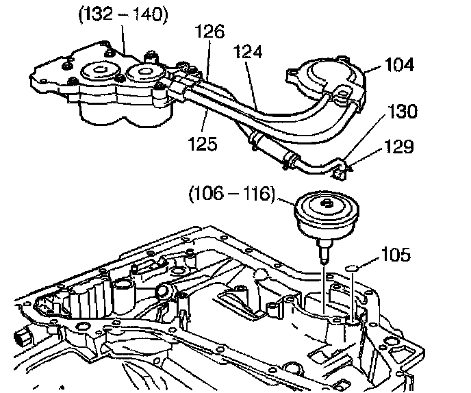 5. Remove the 1-2 and 2-3 accumulator assembly (132-140), the pipe assembly (124-126) and the manual 2-1 band servo cover (104).