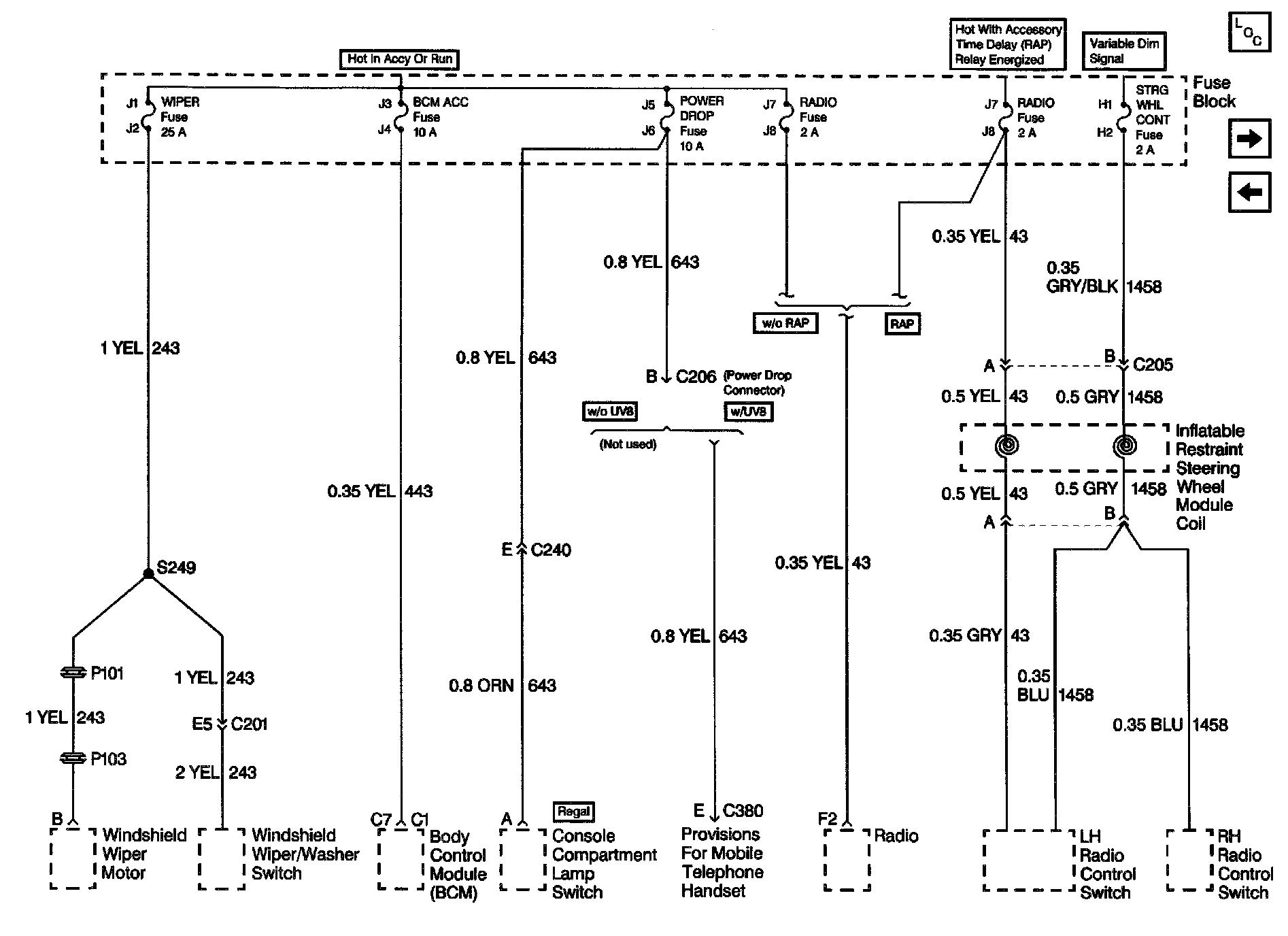 Fuse Block Details Schematics: Wiper, BCM ACC, Power Drop, Radio And STRG WHL CONT Fuses: