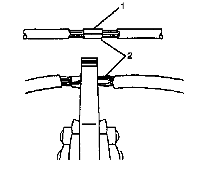 7. Center the splice clip (2) over the stripped wires (1) and hold the clip in place.