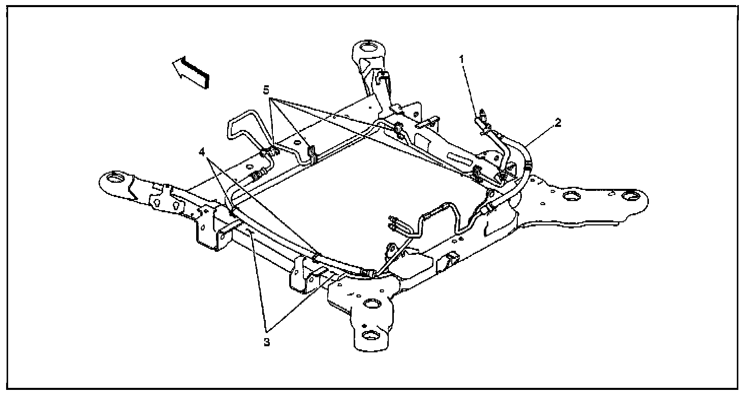 ^ From the forward side of the front engine mount, route the pump end of the hose assembly to the RH side of the vehicle, along the RH engine frame crossmember and up to the steering pump assembly.