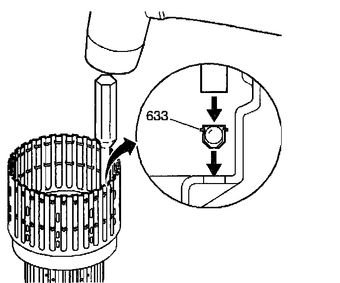 Use a 9.5 mm (3/8 inch) drift punch and mallet in order to assemble a new ball check valve assembly (633) into the input clutch housing.