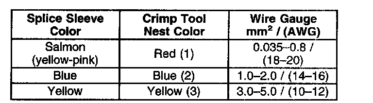 4. Select the proper sealed splice sleeve according to the wire size. Refer to the above table at the beginning of the repair procedure for the color coding of the splice sleeves and the crimp tool nests.