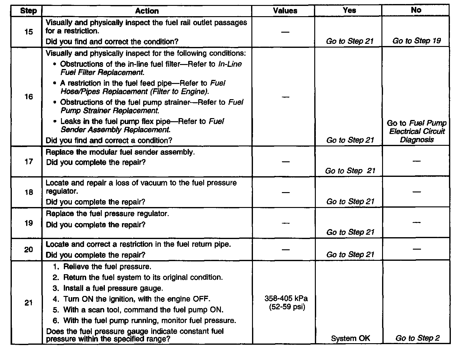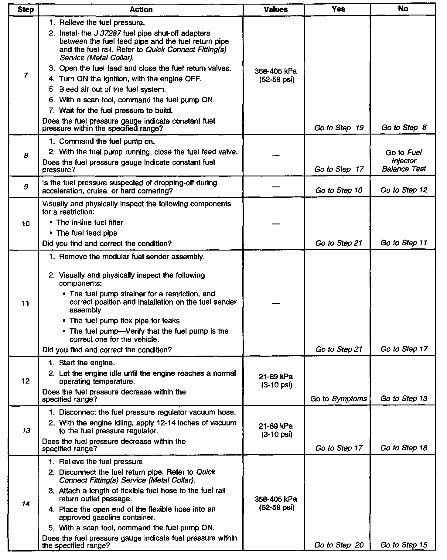 14. This test determines if the high fuel pressure is due to a restricted fuel return pipe or fuel pressure regulator. A rich condition may cause a DTC P0132 or DTC P0172 to set. Driveability conditions associated with rich conditions can include hard starting (followed by black smoke) and a strong sulfur smell in the exhaust.
