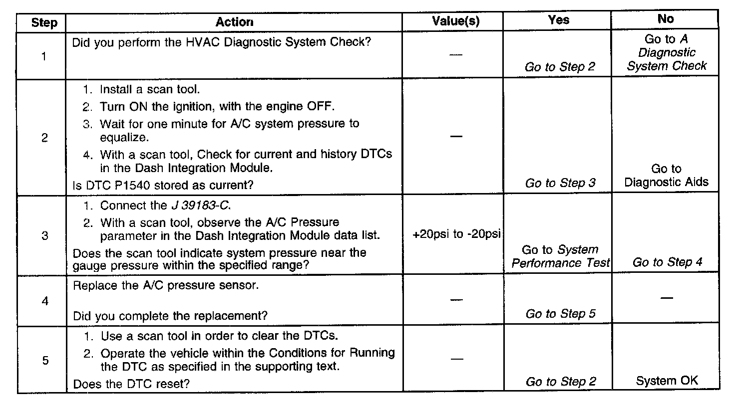 ^ When the A/C refrigerant pressure drops to less than 1386 kPa (201 psi) the DIM will clear the current DTC and go to a history DTC. If A/C is still requested, the DIM will then enable the A/C clutch.