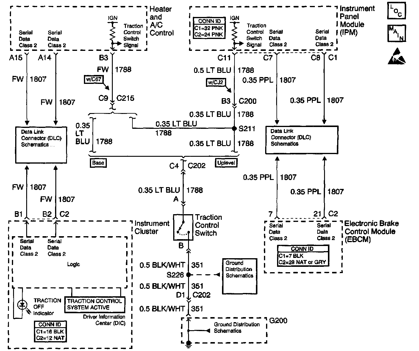 The TRACTION OFF indicator is controlled by the instrument cluster via class 2 serial data messages from the EBCM. When the heater and A/C control (w/C67) or the Instrument Panel Module (IPM) (w/CJ2) sees the traction control switch input grounded through the momentary traction control switch, it sends a class 2 message to the EBCM that tells the EBCM that the traction control switch has been pressed. The EBCM then disables traction control and sends a message to the instrument cluster to turn the TRACTION OFF indicator ON. Each time the ignition is cycled from OFF to ON, the traction control system is enabled.