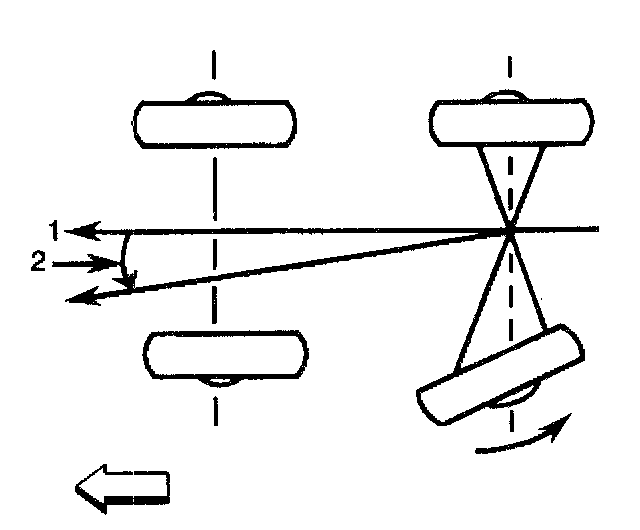 The front wheels aim or steer the vehicle. The rear wheels control tracking. The tracking action is relative to the thrust angle (2). Thrust angle (2) is defined as the path that the rear wheels will take. The thrust angle (2) should be aligned with the body centerline (1).