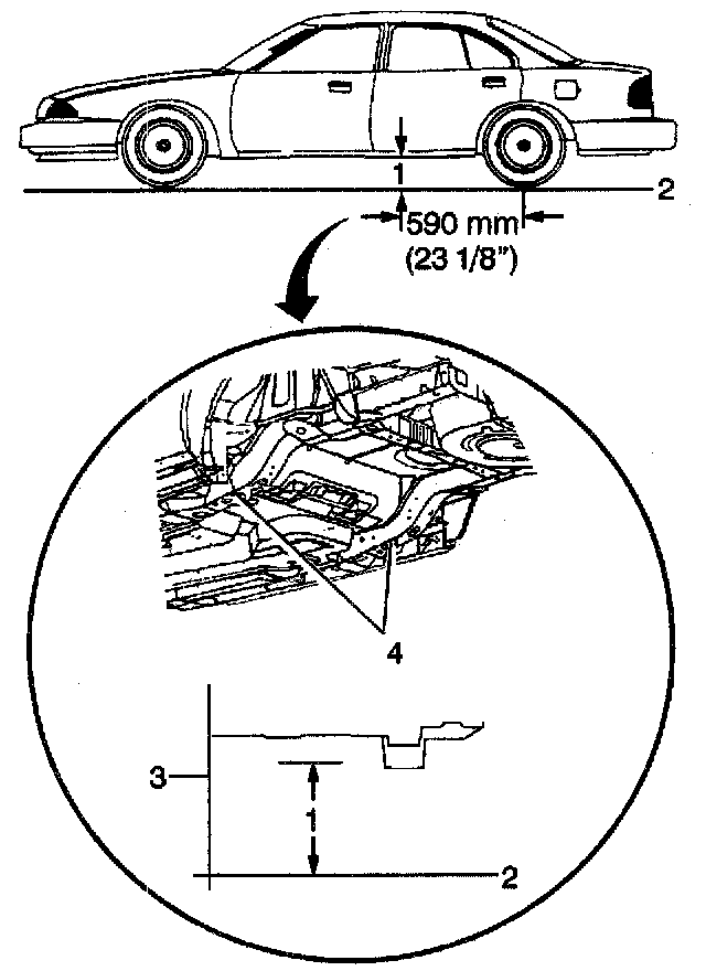 11. Measure the distance (1) from the ground (2) to the rear underbody points (4). This distance (1) 213 - 233 mm (8 3/8 to 9 3/16 inch)