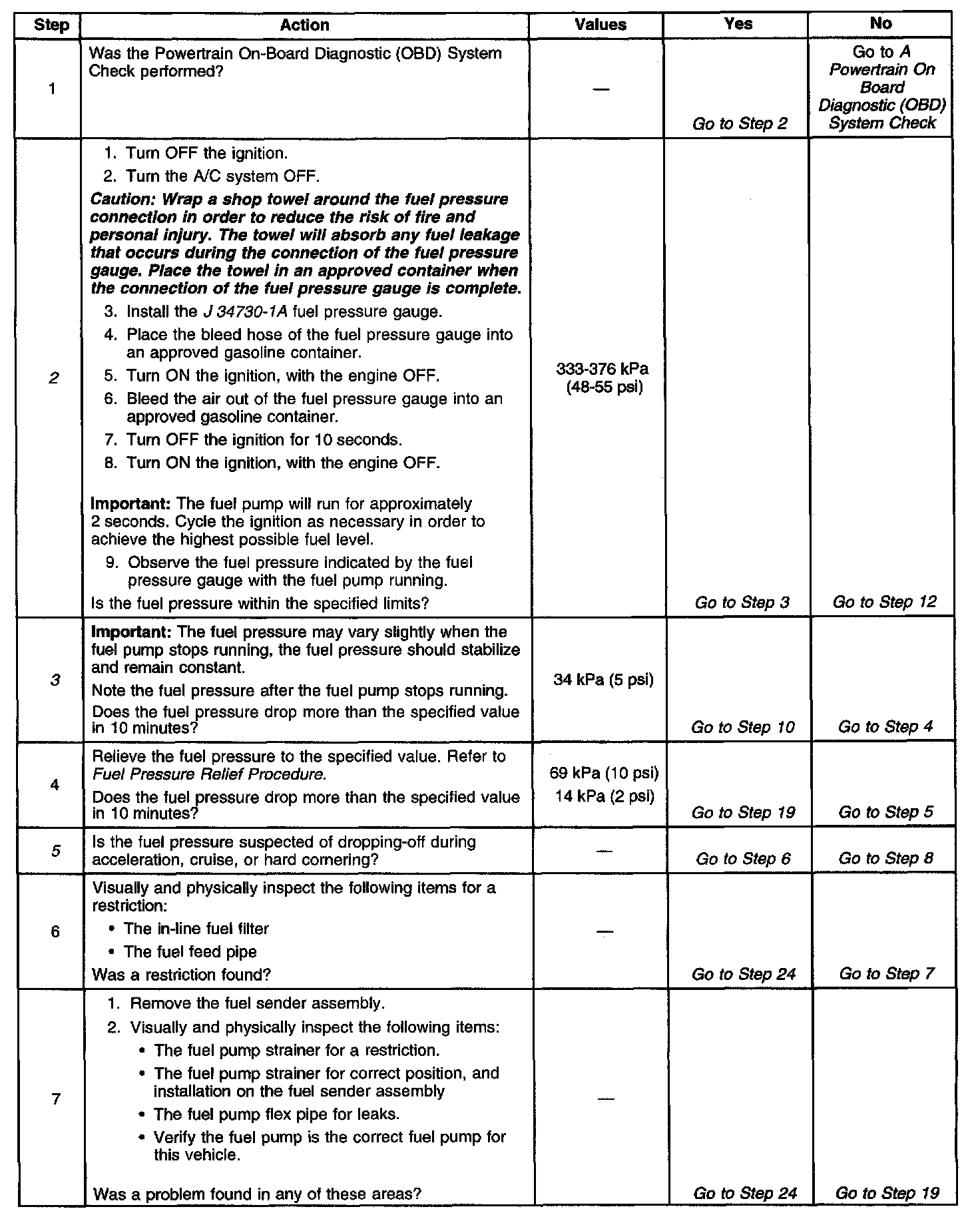 15. A lean condition may result from the fuel pressure being below 333 kPa (48 psi). A lean condition may cause a DTC P0131 or a DTC P0171 to set. Driveability conditions associated with lean conditions can include hard starting (when the engine is cold), hesitation, poor driveability, lack of power, surging, and misfiring.