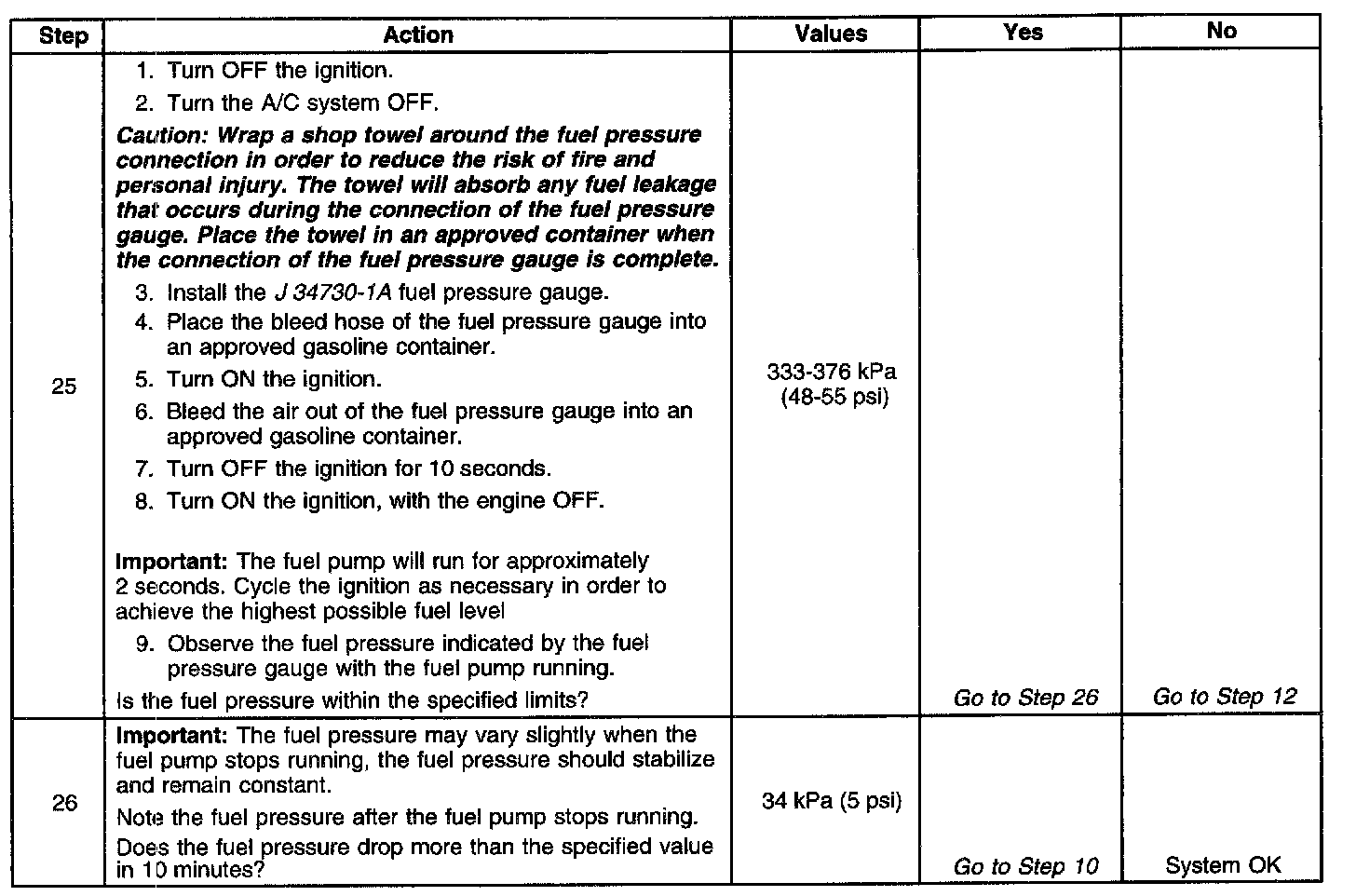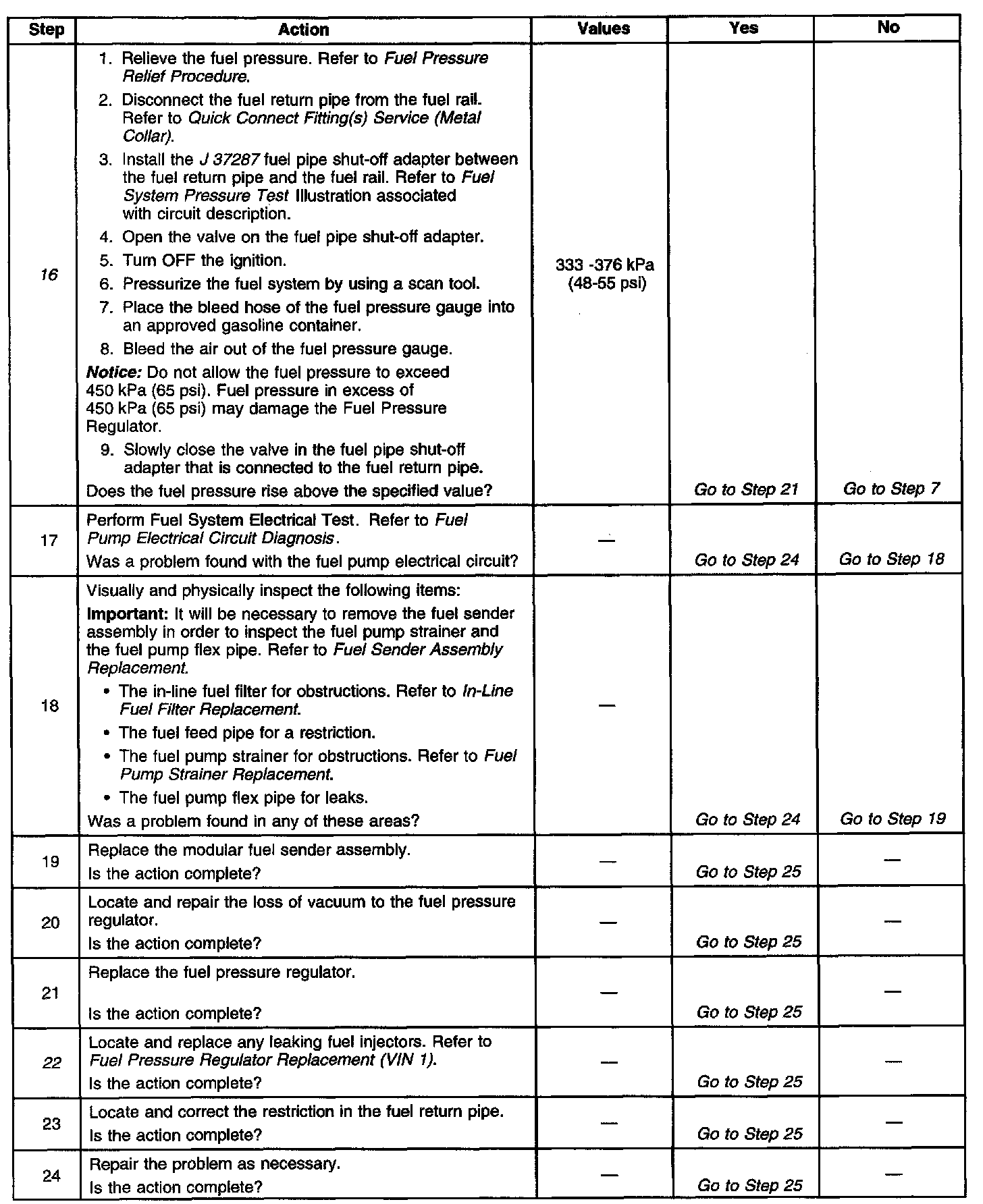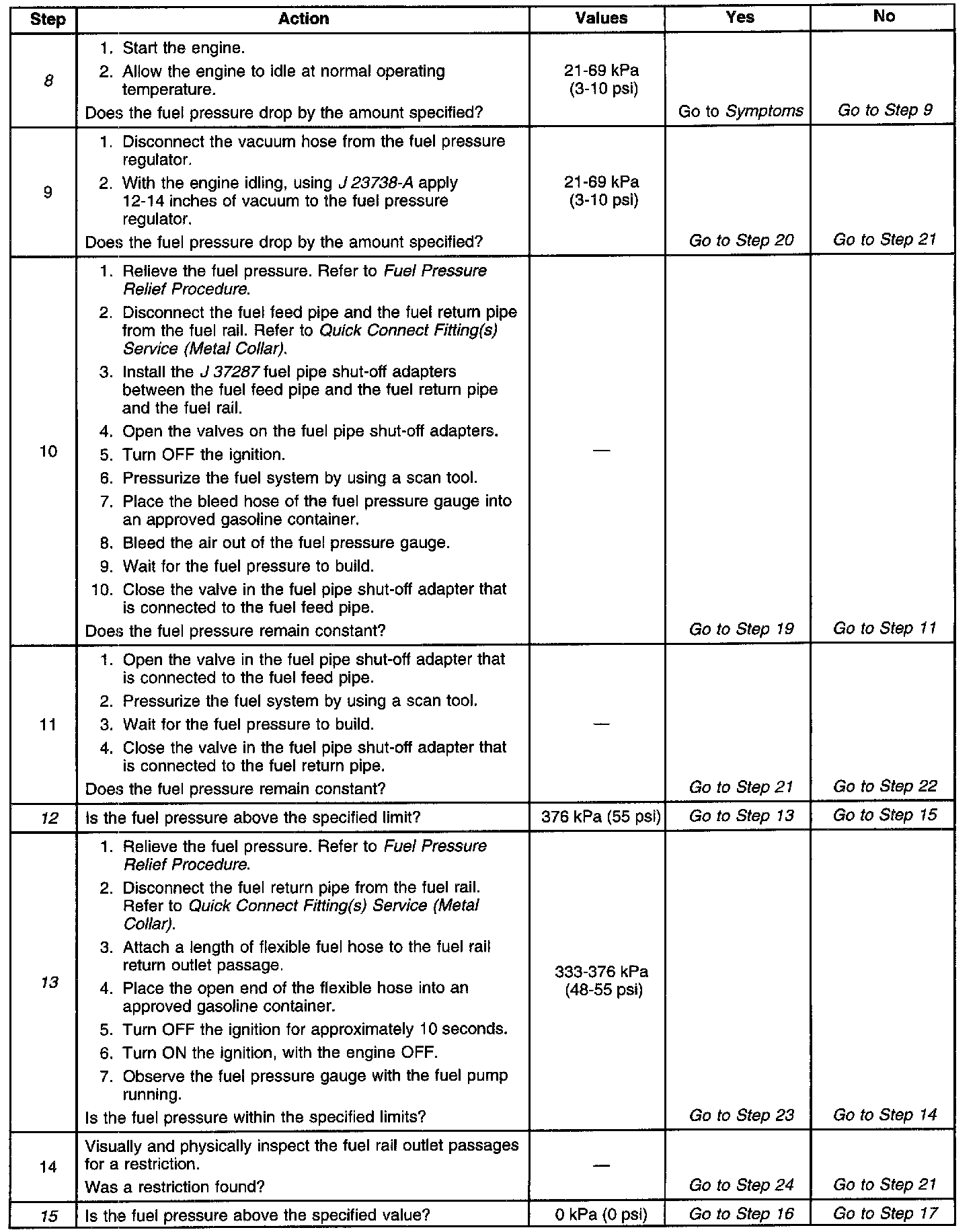 13. This test determines if the high fuel pressure is due to a restricted fuel return pipe or if the high fuel pressure is due to a faulty fuel pressure regulator.