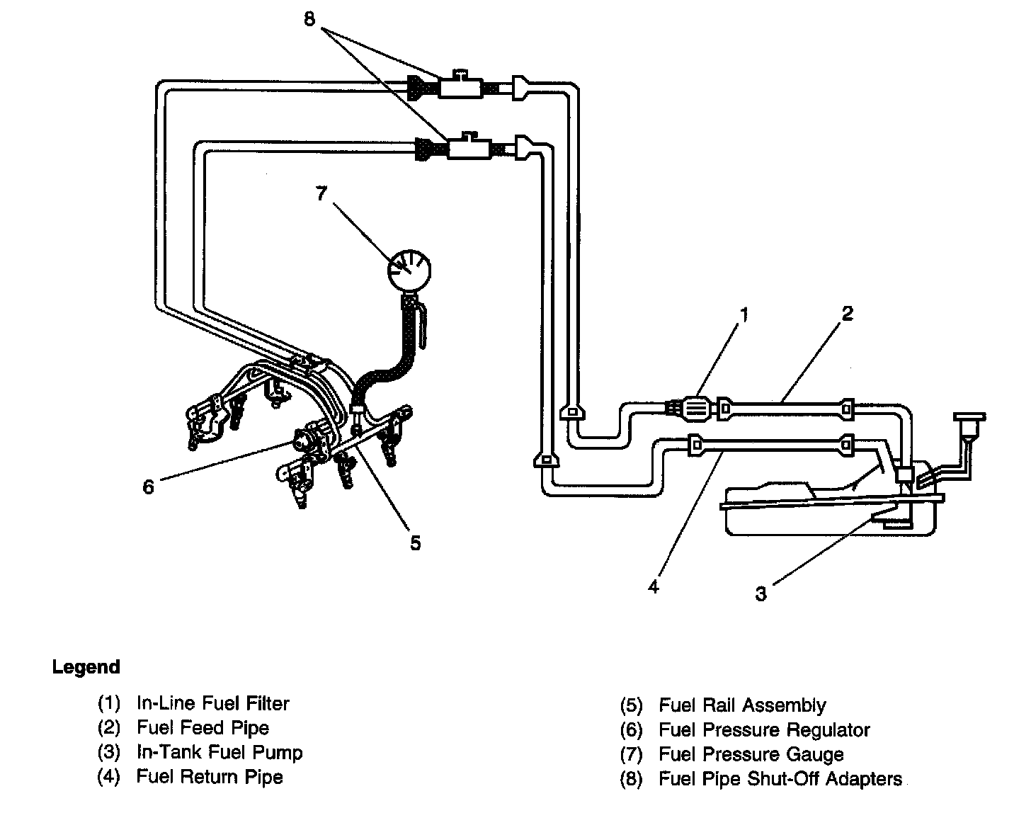 A fuel pressure regulator, attached to the fuel rail, keeps the fuel available to the fuel injectors at a regulated pressure. Unused fuel is returned to the fuel tank by a separate fuel return pipe. The fuel pump flex pipe functions as a conduit for transporting pressurized fuel from the fuel pump to the above cover fuel feed pipe. The fuel pump flex pipe also eliminates fuel pump generated pressure pulse noise, and eliminates clamps formerly needed for rubber hoses or nylon pipes. The fuel pressure gauge and fuel pipe shut-off adapters are used for fuel system diagnosis.