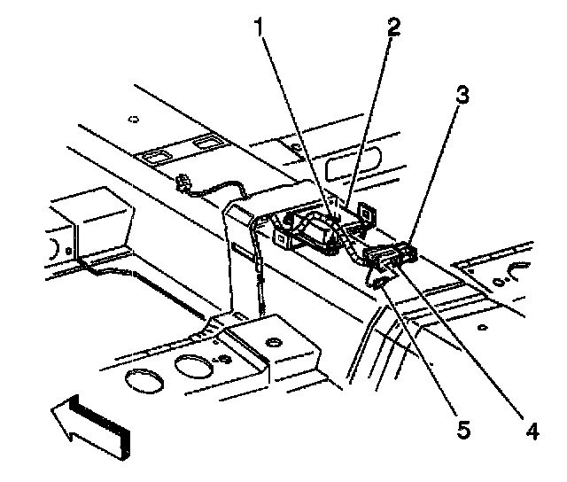 4. Remove the Connector Position Assurance (CPA) (1) from the inflatable restraint sensing and diagnostic module (SDM) wiring harness connector (2).