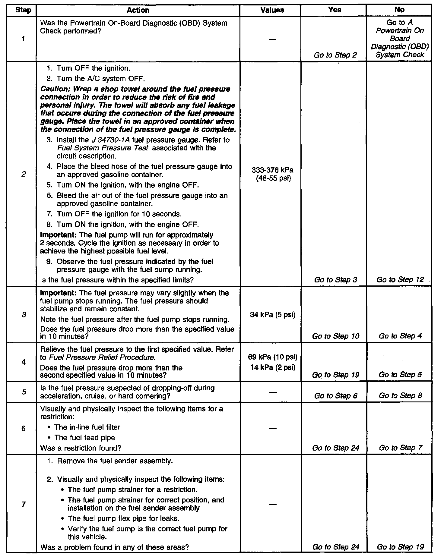 15. A lean condition may result from the fuel pressure being below 333 kPa (48 psi). A lean condition may cause a DTC P0131 or a DTC P0171 to set. Driveability conditions associated with lean conditions can include hard starting (when the engine is cold), hesitation, poor driveability, lack of power, surging, and misfiring.