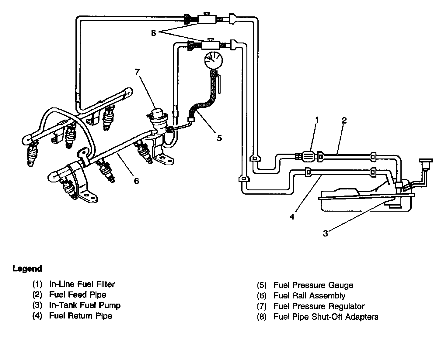 A fuel pressure regulator, attached to the fuel rail, keeps the fuel available to the fuel injectors at a regulated pressure. Unused fuel is returned to the fuel tank by a separate fuel return pipe. The fuel pump flex pipe functions as a conduit for transporting pressurized fuel from the fuel pump to the above cover fuel feed pipe. The fuel pump flex pipe also eliminates fuel pump generated pressure pulse noise, and eliminates clamps formerly needed for rubber hoses or nylon pipes. The fuel pressure gauge and fuel pipe shut off adapters are used for fuel system diagnosis.