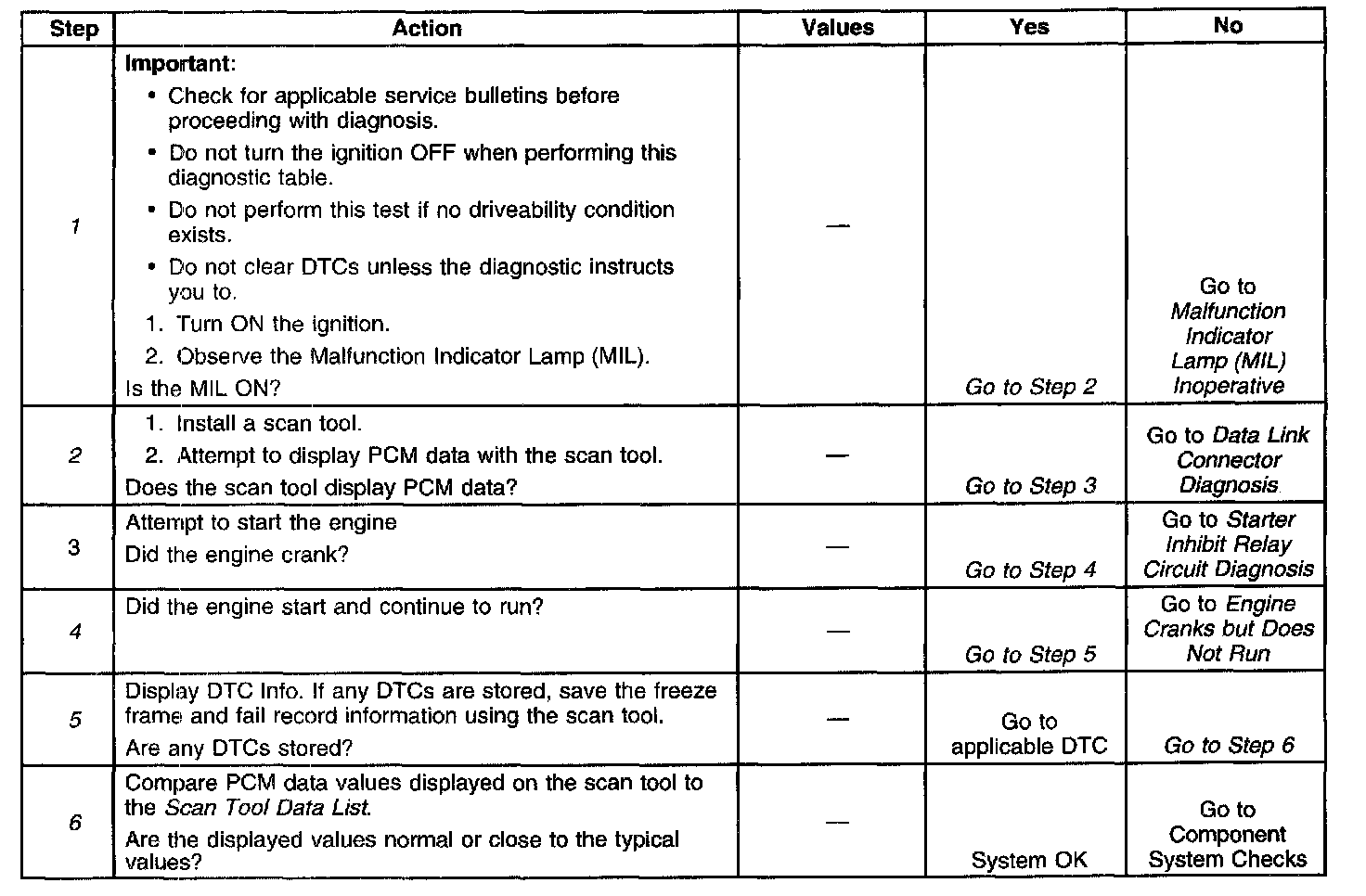 1. The MIL should be ON steady with the key ON I engine OFF. If not, the No Malfunction Indicator Lamp table should be used to isolate the malfunction.