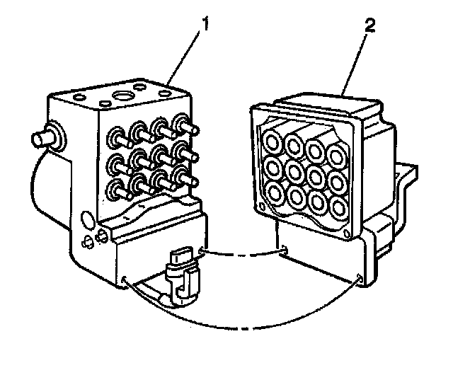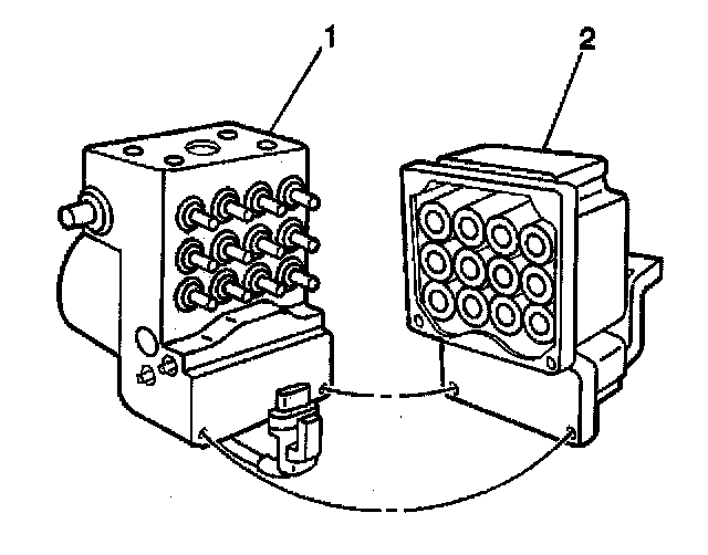 7. Rotate the EBCM connector tab (2) down to the locked position.