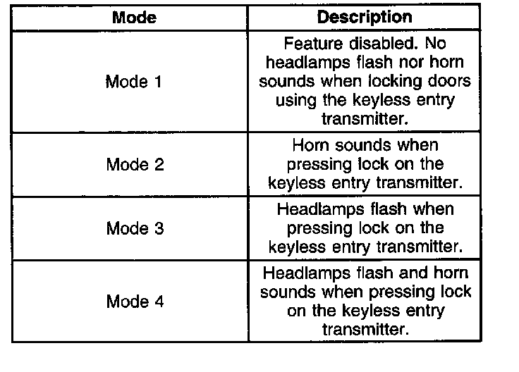 ^ The BCM sounds the chime a number of times equivalent to the remote lock verification mode. A transition past mode 4 repeats the sequence starting with mode 1.