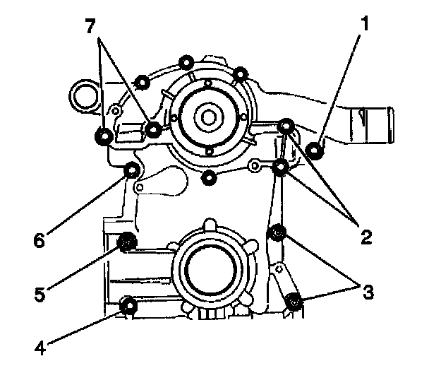 11. Install the engine front cover bolts (1-7).
