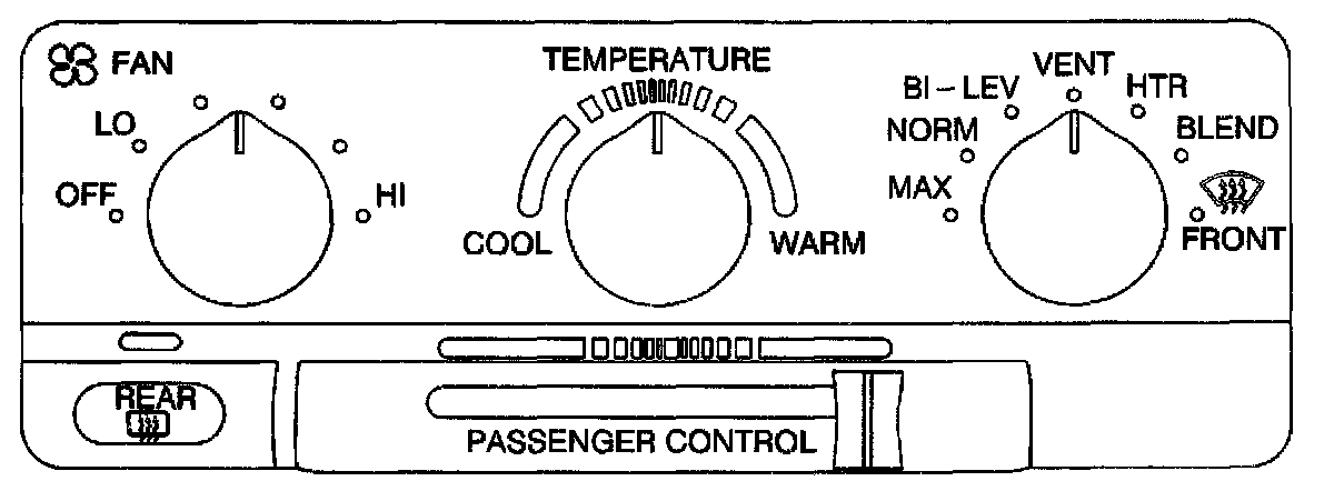 The bottom lever adjusts the air temperature on the Passenger's side independent of the temperature set by he driver. Slide the lever toward the right to raise the temperature. Slide the lever toward the left to lower the temperature.