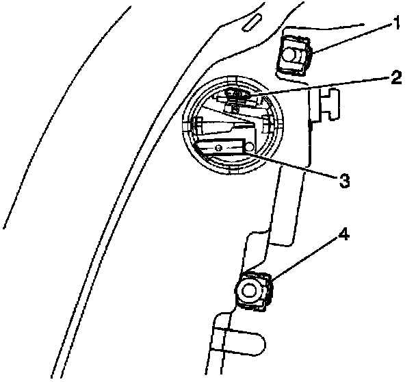 Horizontal and vertical aiming of each of the composite headlamps is done by turning adjusting screws which move the headlamp capsule in relation to the headlamp housing assembly. The horizontal adjustment screw (1) is located on the rear upper edge of each of the headlamp assemblies, toward the outboard side of the vehicle. The vertical adjustment screw (4) is located on the rear upper edge of each of the headlamp assemblies, toward the center of the vehicle.