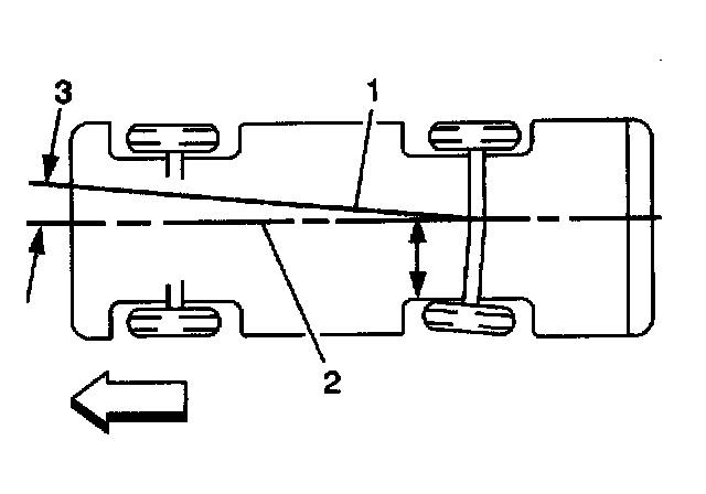 In the illustration, toe-in is shown on the left rear wheel, moving the thrust line off center. The resulting deviation (3) from the centerline is the thrust angle (1).