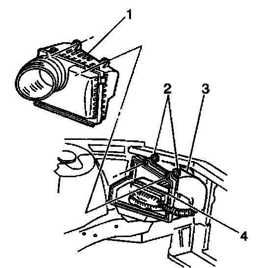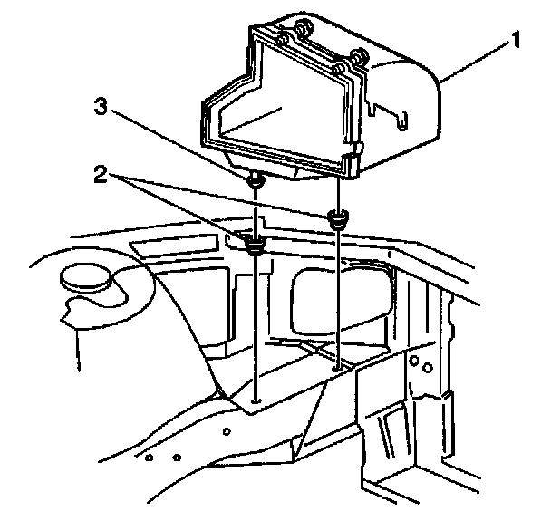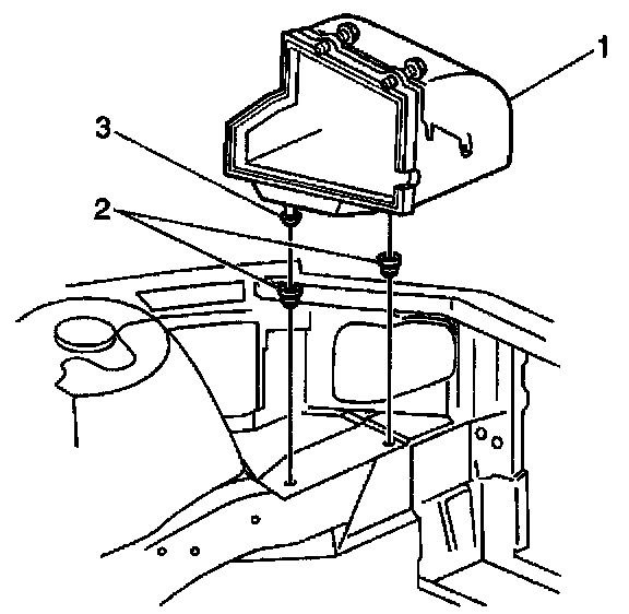 1. Carefully install the PCM housing (1) by pushing the housing into the 2 rubber grommets (2) in the engine compartment.