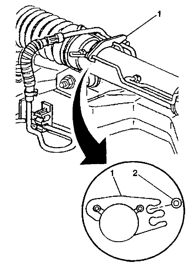 7. Remove the power steering pressure line (2) from the clamps (1) on the power steering gear.