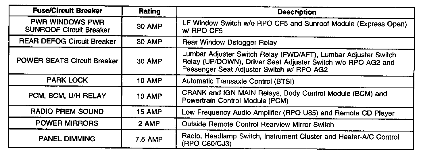 Instrument Panel Fuse Block, Fuse Application Table (Part 2 Of 2):