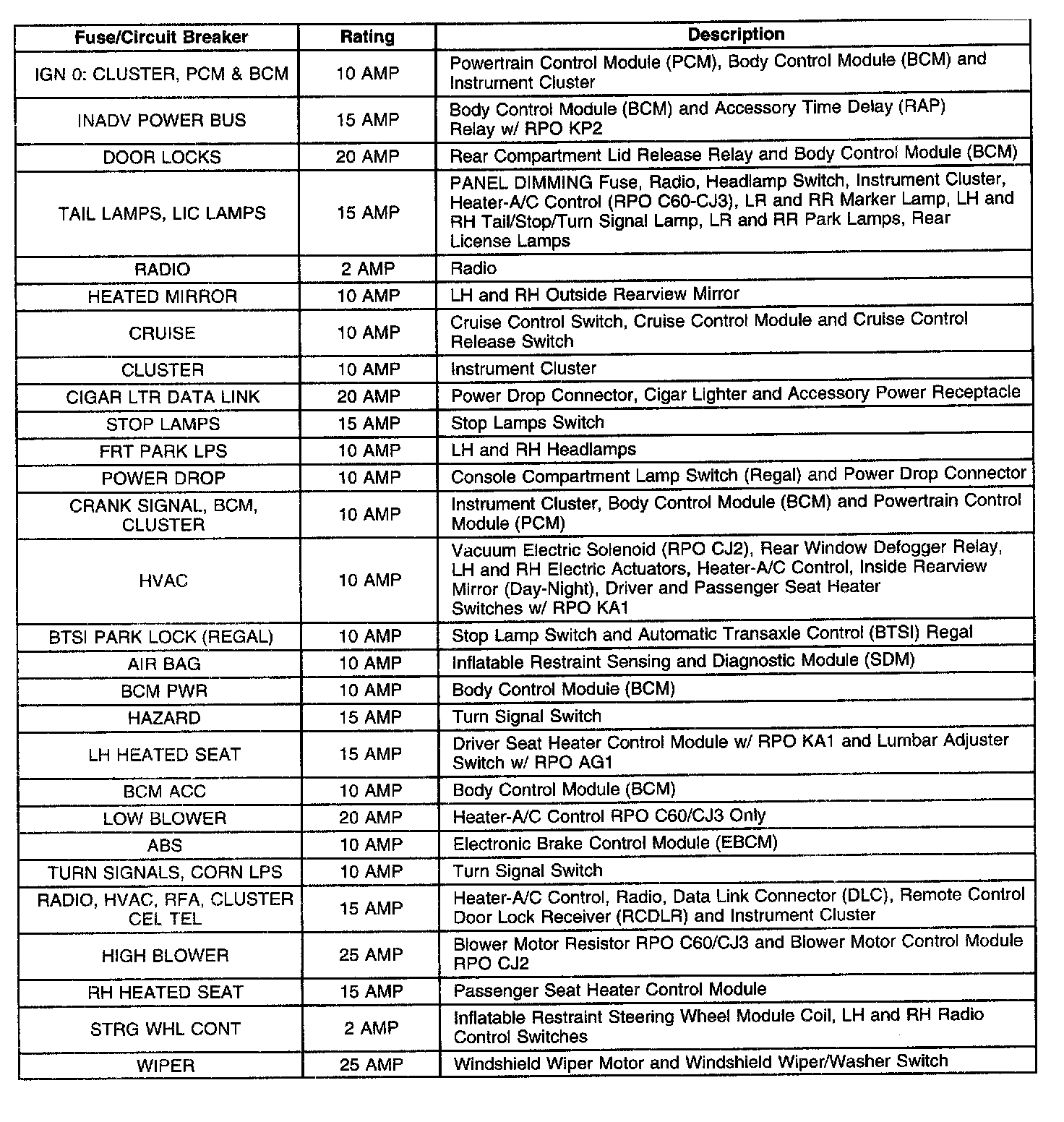 Instrument Panel Fuse Block, Fuse Application Table (Part 1 Of 2):