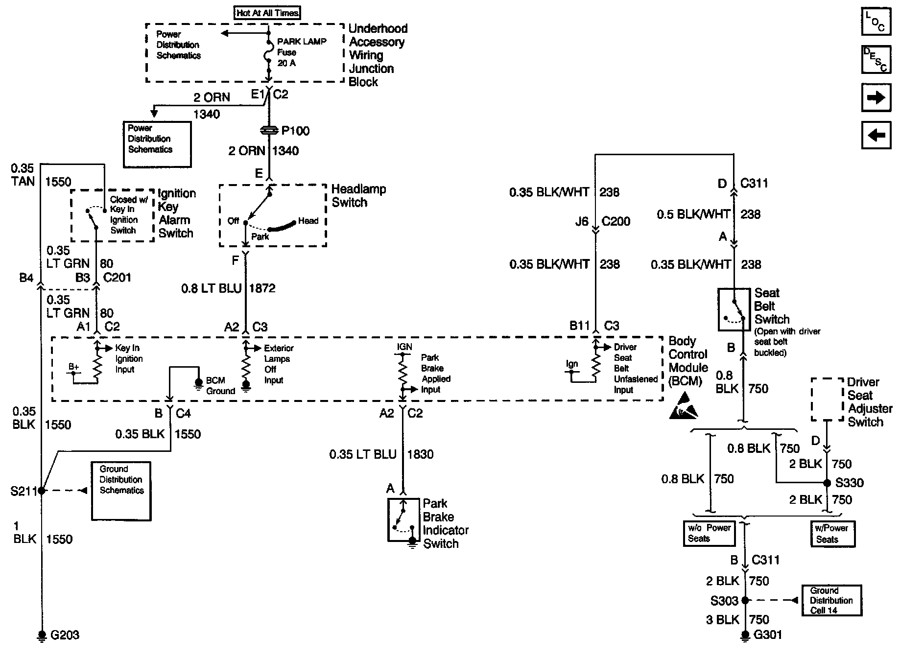 Body Control Module Schematics : Ignition Key Alarm Switch, Headlamp Switch, Park Brake Indicator Switch, Driver Seat Adjuster Switch And Seat Belt Switch: