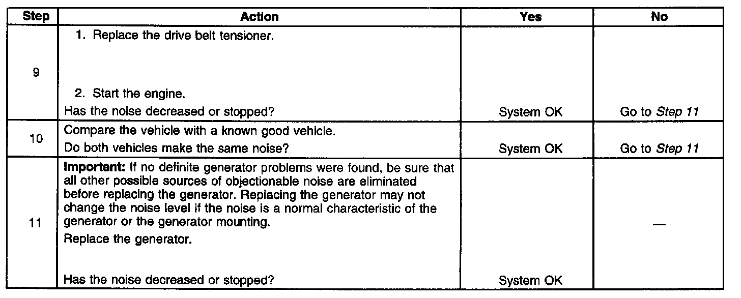 DIAGNOSTIC AIDSNoise from a generator may be due to electrical or mechanical noise Electrical noise (magnetic whine) usually varies with the electrical load placed on the generator and is a normal operating characteristic of all generators. When diagnosing a noisy generator, it is important to remember that loose or misaligned components around the generator may transmit the noise into the passenger compartment and that replacing the generator may not solve the problem.